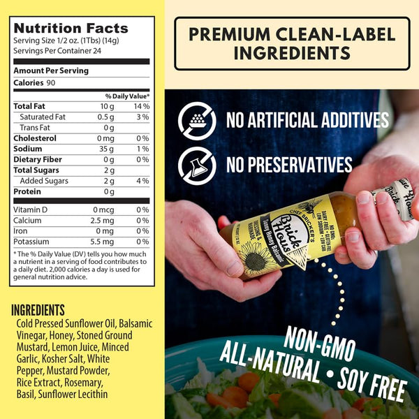 Clean Ingredients You Can Trust – Cold-pressed sunflower oil, honey, balsamic vinegar, and herbs. No artificial ingredients or preservatives.